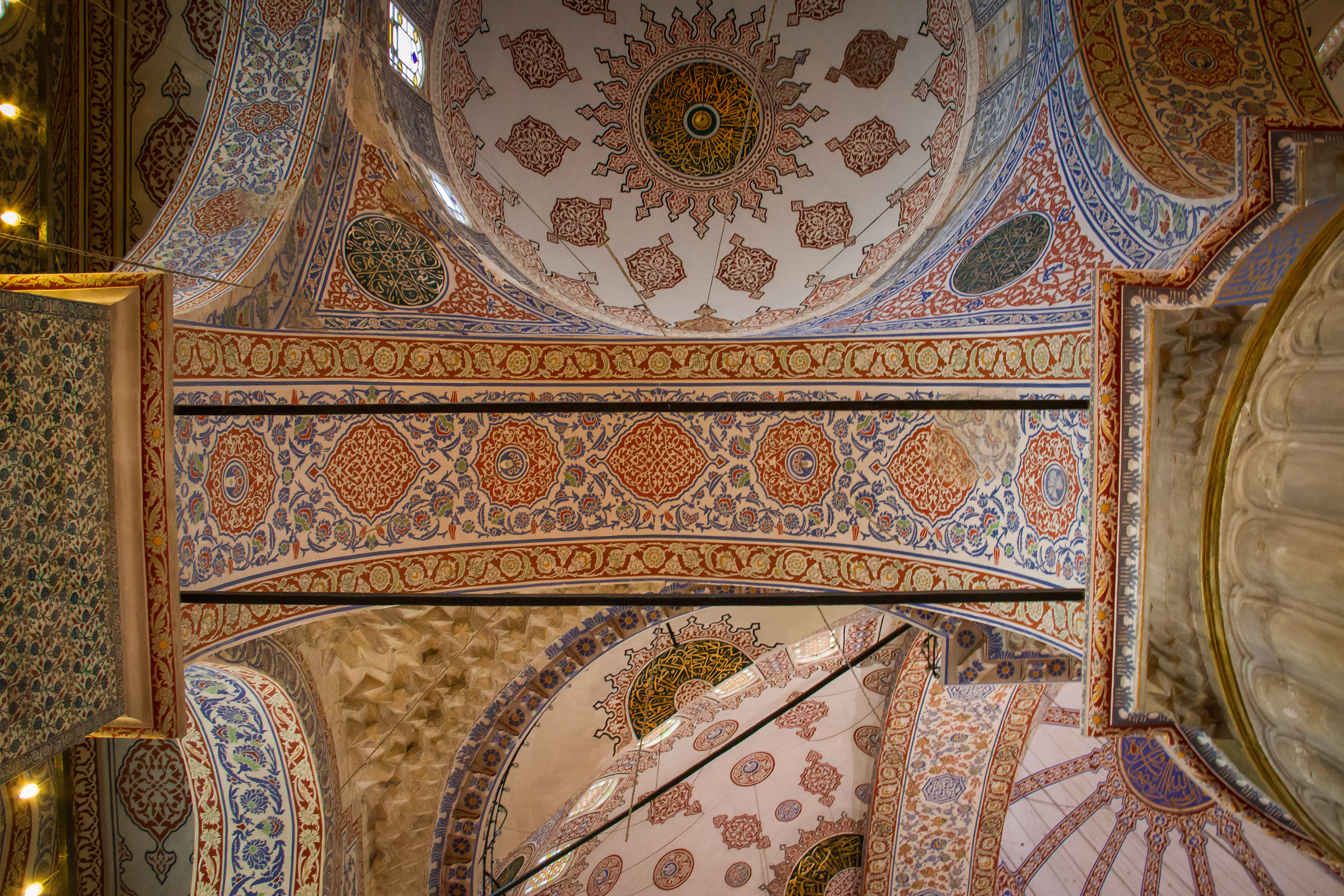 Ceiling decorations and domes as viewed from the interior at the Blue Mosque in Istanbul Turkey