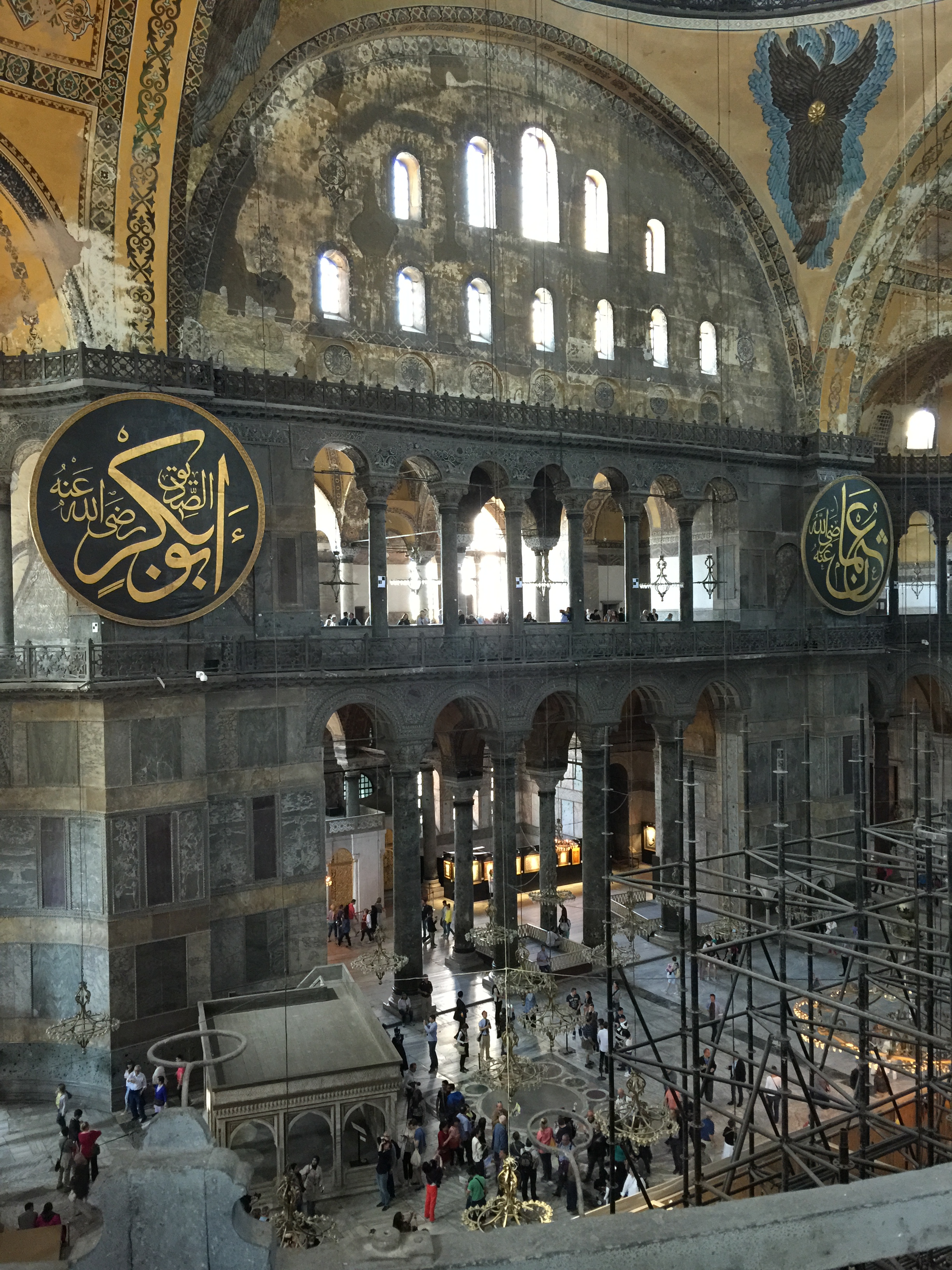View from North Gallery looking across nave toward South Gallery. Down in the nave the little square building/platform is the Ottoman era Müezzin Mahfihli from which the muezzin would provide responses to the Imam. Also the square containing circular tiles on the floor is known as the omphalion or coronation square which, during the Byzantine Empire, marks the spot upon which the emperors were crowned.