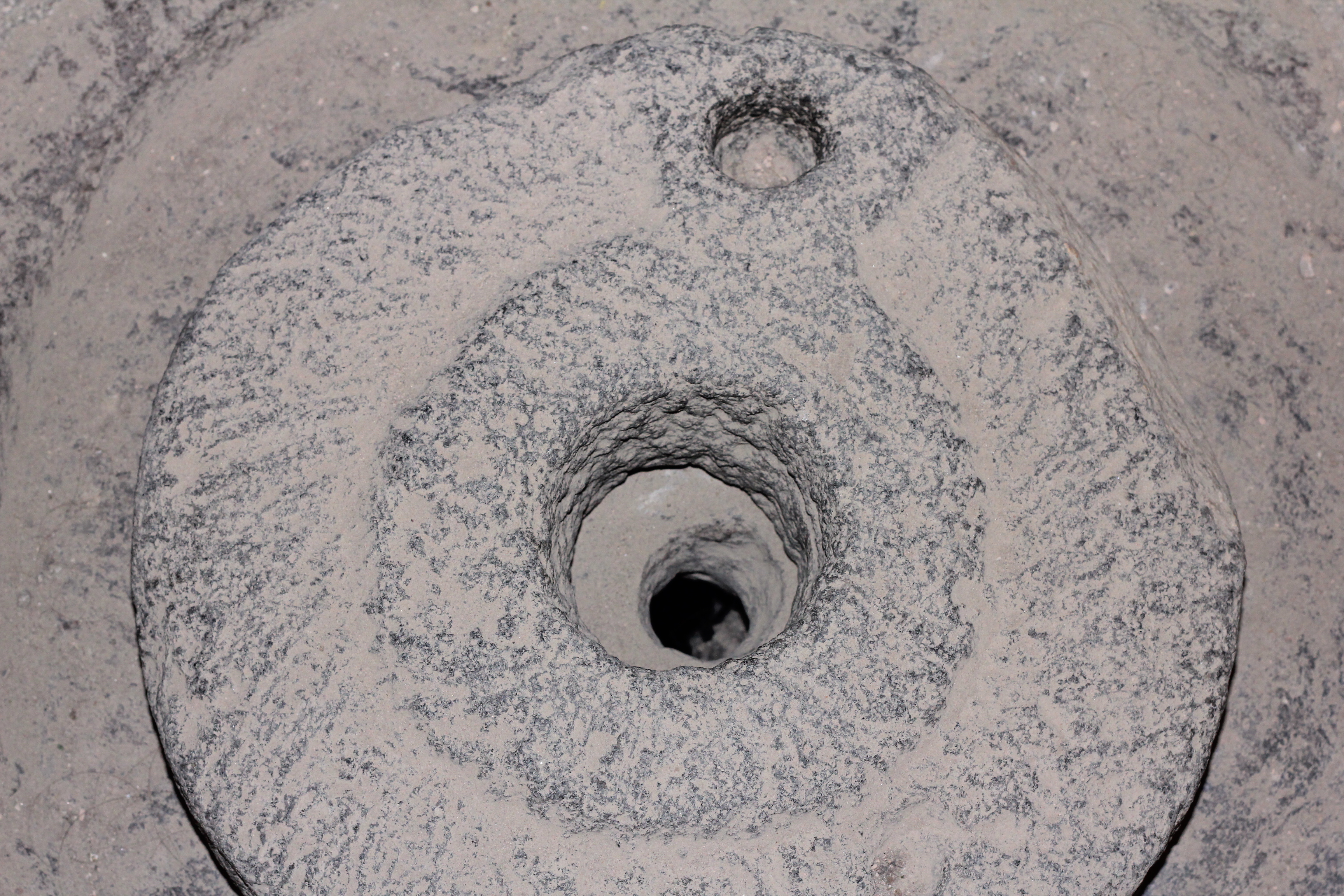 Photo taken at the Kaymakli Underground City in Cappadocia Turkey. Precise identification of the object in the photo is not possible. Perhaps this is related to food storage and/or a door.