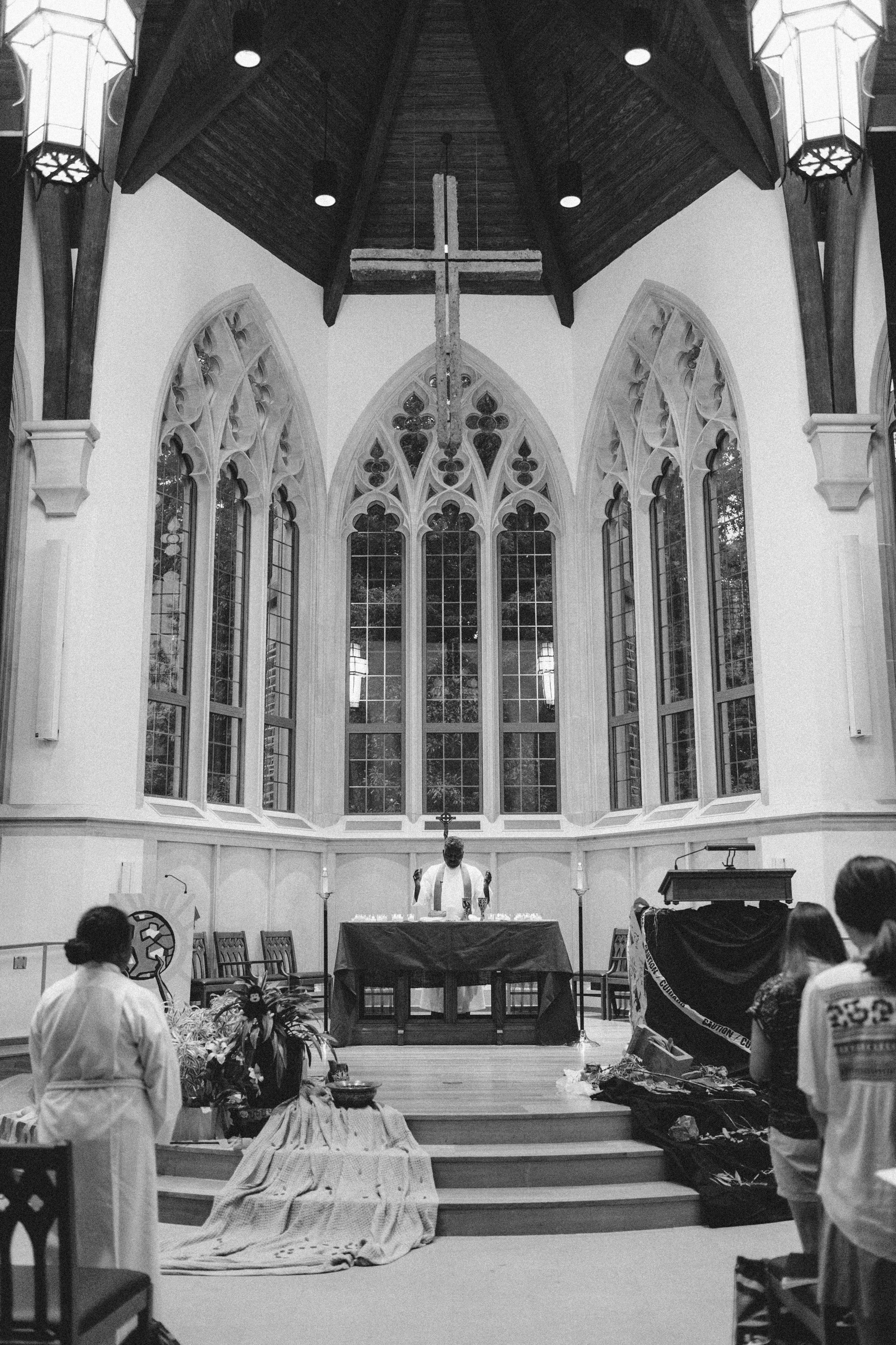 DYA celebrant praying over communion elements in Goodson Chapel