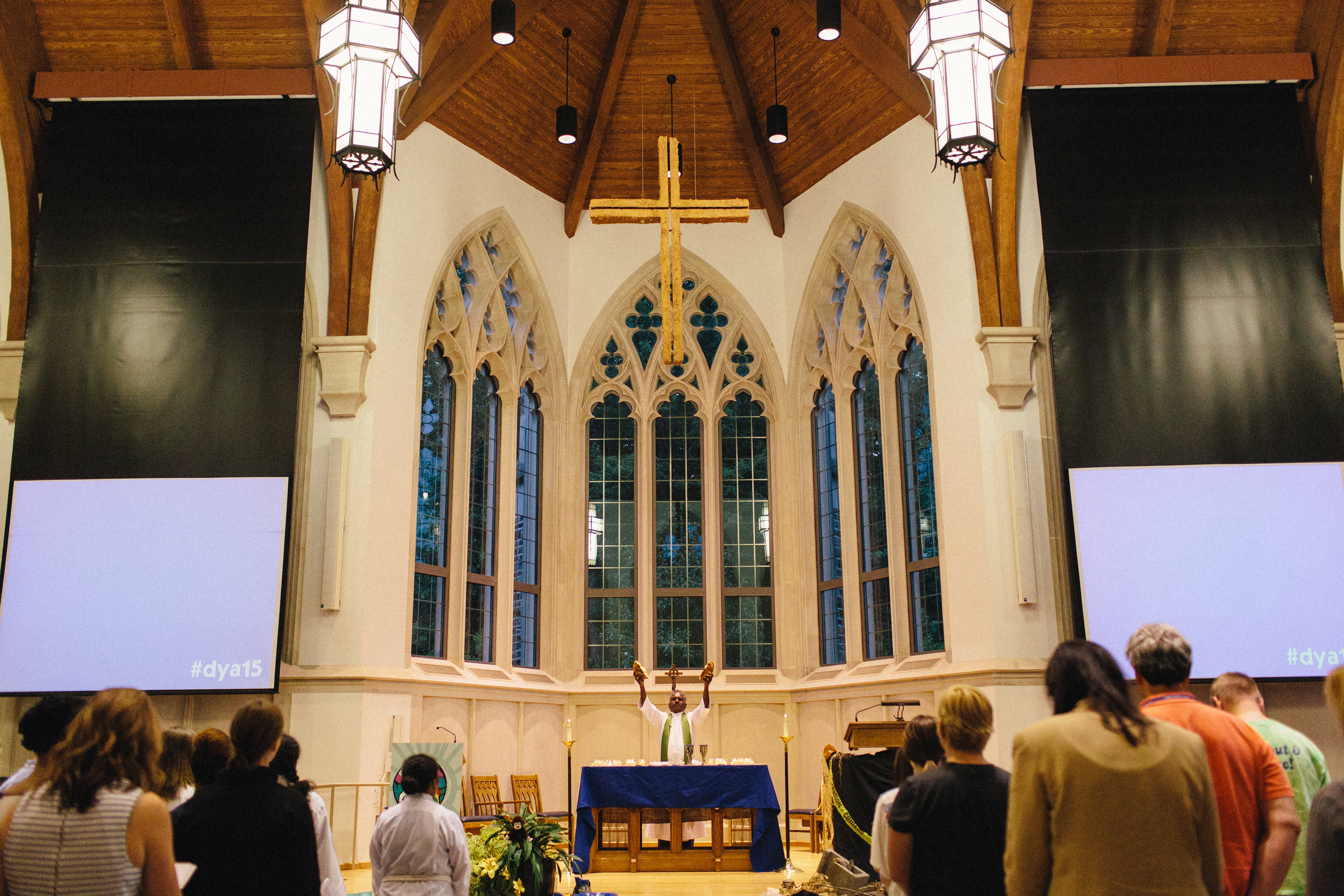 DYA celebrant praying over communion elements in Goodson Chapel